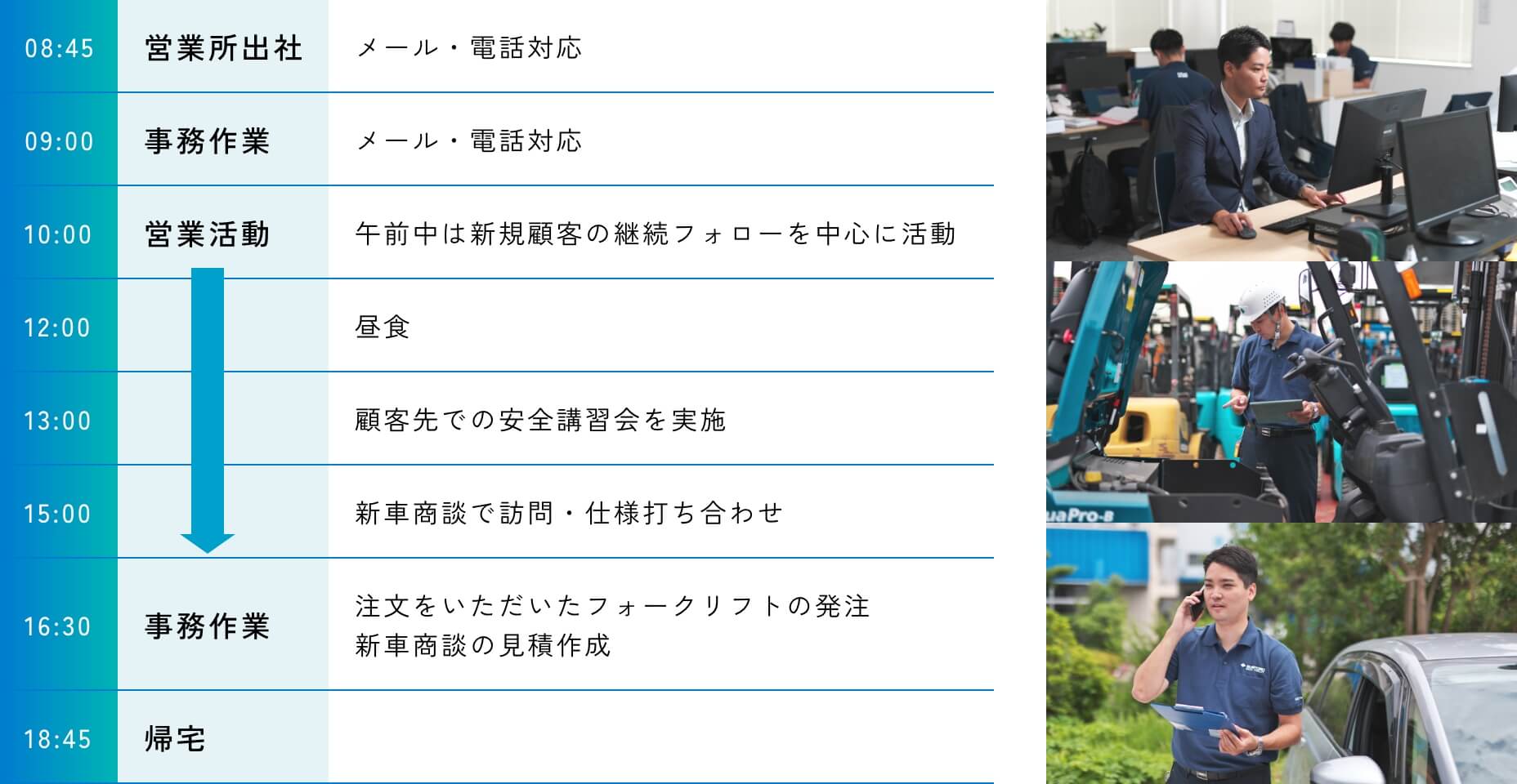 当社のセールスは、フォークリフトを販売するだけの仕事ではありません。日々の地道な営業活動を通じ、お客様と同じ目線で現場のことを考え、物流に関わる課題解決への手段を提案することがミッションです。時にはフォークリフト以外のソリューションを提案することもあります。誰よりも親身になって、お客様にとって最適なソリューションを追求する、その繰り返しによって、単なる「販売営業」という枠を越えた物流のパートナーになることを目指しています。